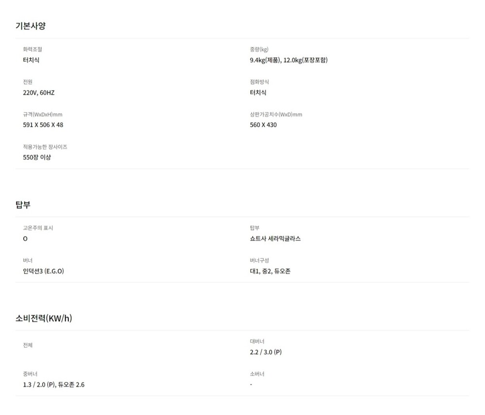 국내 유일 사이즈 제한 없는 인스톨프리 / 48mm슬림핏 / 듀오쿠킹존 / 쇼트글라스적용 / 전력제어타입